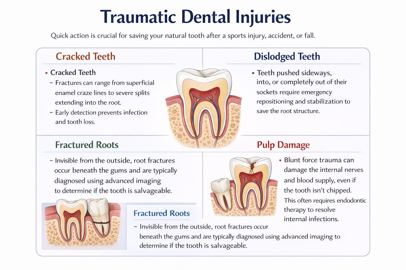 Dental trauma can occur due to sports injuries, accidents, or falls.